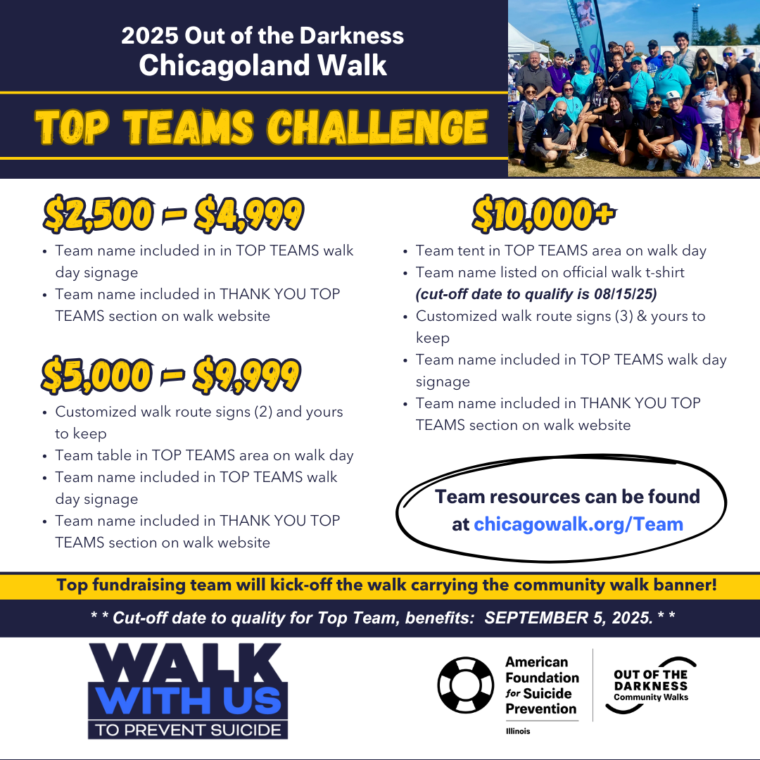 You can make a difference by creating a team and walking in the Out of the Darkness Chicagoland Walk.